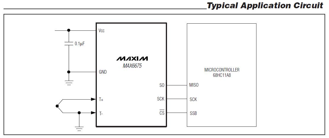 MAX6675ISA features: (1)Direct Digital Conversion of Type -K Thermocouple Output; (2)Cold-Junction Compensation; (3)Simple SPI-Compatible Serial Interface; (4)12-Bit, 0.25℃ Resolution; (5)Open Thermocouple Detection.